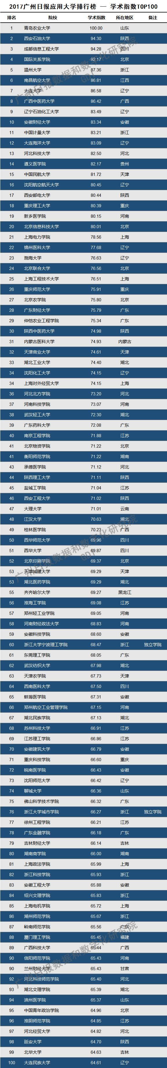 下附“2017广州日报应用大学排行榜 — 学术指数TOP100”的完整榜单: