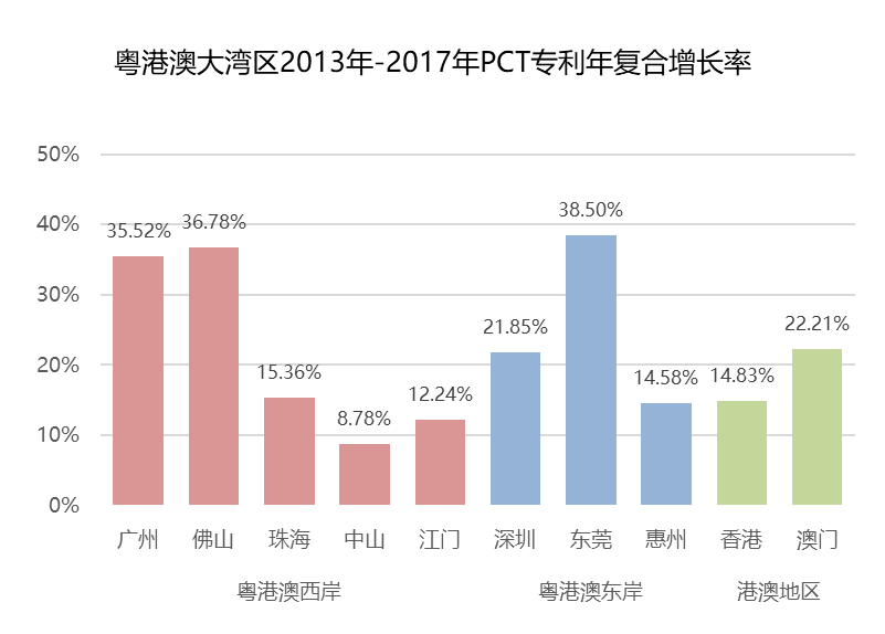 以PCT专利年复合增长率分析,10座城市中东莞以38.50%位列第一,其次是佛山、广州、澳门、深圳(考虑到2017年肇庆的PCT专利数为零,因此不列入比较)