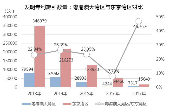 2013年—2017年粤港澳大湾区的发明专利施引数量低于东京湾区,2013年粤港澳大湾区的发明专利施引数为东京湾区的22.94%,2016年差距加大为7.79%,2017年差距缩小为46.76%。
