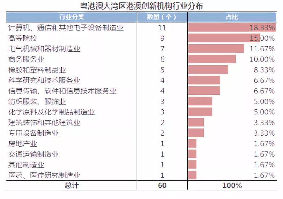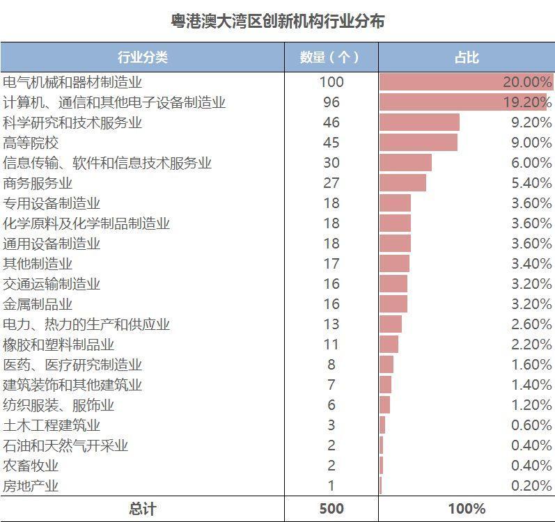 数据显示,湾区西岸共计300家创新机构入围,分布在20个行业。其中,电气机械和器材制造业(71家),计算机、通信和其他电子设备制造业(35家),科学研究和技术服务业(31家)居于前三位,高等院校位列第四(28家),通用设备制造业和信息传输、软件和信息技术服务业并列第五(15家)。