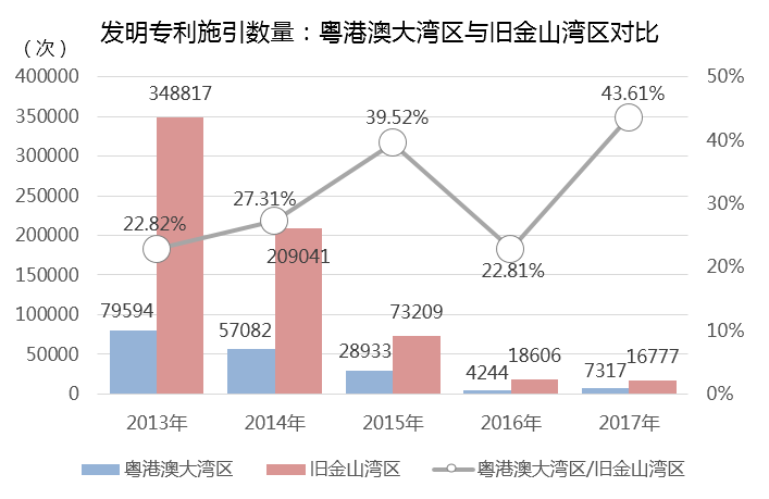 数据显示,2013年—2017年粤港澳大湾区的发明专利施引数量低于旧金山湾区,其中2013年、2014年、2016年较为明显。2013年粤港澳大湾区的发明专利施引数为旧金山湾区的22.82%,2015年差距有所缩小至39.52%,2016年再次降至22.81%;2017年差距再次缩小至43.61%。