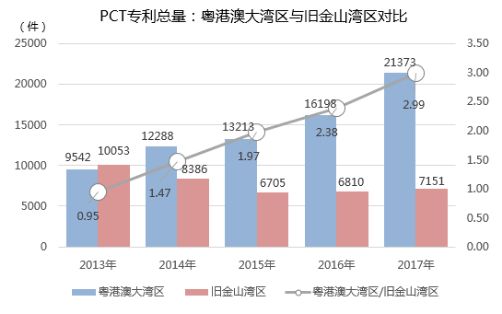数据显示,2013年—2017年粤港澳大湾区的PCT专利总量除2013年外均高于旧金山湾区。2013年粤港澳大湾区PCT专利总量与旧金山湾区相当,为旧金山湾区的95%,到2014年粤港澳大湾区PCT专利总量约为旧金山湾区的1.5倍,2016年为2.4倍,2017年达到3倍。
