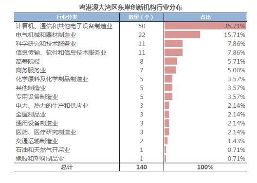 湾区东岸共计140家创新机构入围,分布在16个行业,其中,计算机、通信和其他电子设备制造业(50家)位居第一,电气机械和器材制造业(22家)位居第二,信息传输、软件和信息技术服务业、科学研究和技术服务业(11家)并列第三。