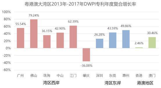 在年复合增长率上,湾区西岸表现最为突出的是佛山,达79.24%,其次是江门和广州,分别为62.39%、55.54%;湾区东岸,惠州表现明显,深圳的年复合增长率低于东莞和惠州;澳门由于专利体量小,增长率高于香港。