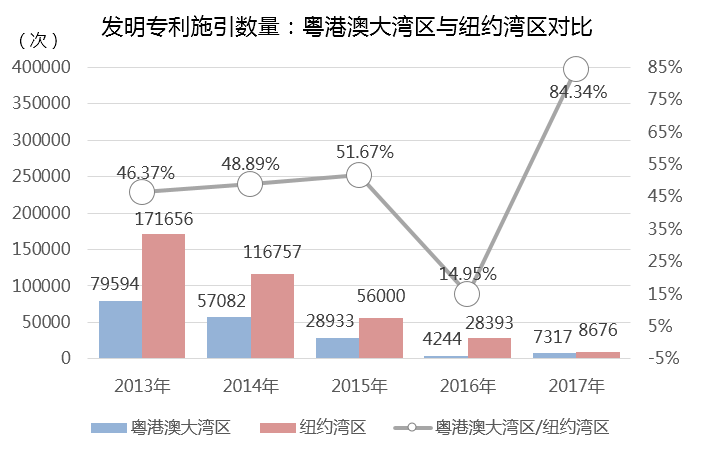 2013年—2017年粤港澳大湾区的发明专利施引数量低于纽约湾区。2013年粤港澳大湾区的发明专利施引数为纽约湾区的46.37%,2016年差距变大为14.95%,2017年差距缩小为84.34%。