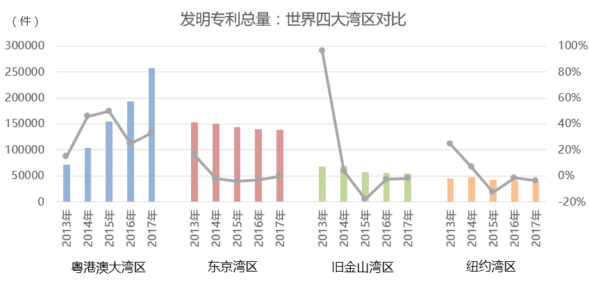 以近五年数据分析,粤港澳大湾区的发明专利总量处于上升趋势,旧金山湾区、纽约湾区前两年处于上升趋势,近三年则处于下降趋势,东京湾区近四年呈现持续下降趋势。2017年,粤港澳大湾区的增长率为33.19%,东京湾区为-0.38%,旧金山湾区为-1.86%,纽约湾区为-3.73%,同时显示粤港澳大湾区在发明专利总量上与其他三湾区逐渐拉开距离:粤港澳大湾区2017年发明专利总量达25.80万件,东京湾区、旧金山湾区、纽约湾区分别为13.91万件、5.44万件、3.96万件。