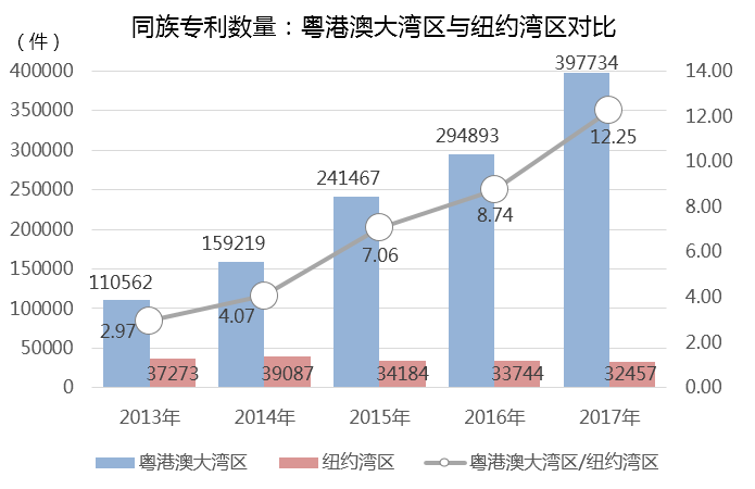 2013年—2017年粤港澳大湾区的同族专利总量远高于纽约湾区。在2013年粤港澳大湾区的同族专利总量约为纽约湾区的3倍,2015年粤港澳大湾区的同族专利总量约为纽约湾区的7倍,2017年差距进一步变大为12倍。