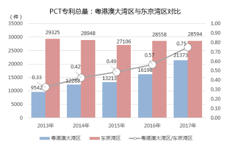 2013年—2017年粤港澳大湾区的PCT专利总量低于东京湾区的PCT专利总量均低于东京湾区的PCT专利总量,2013年为东京湾区的33%,2014年为东京湾区的42%。近两年来差距有所减少,2016年为东京湾区的57%,2017年差距进一步减小,为东京湾区的75%。