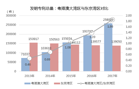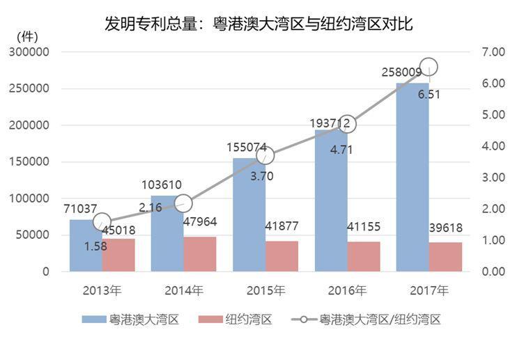 2013年—2017年粤港澳大湾区的发明专利总量超越纽约湾区,2013年粤港澳大湾区的发明专利总量约为纽约湾区的1.6倍,2015年为3.7倍,2017年达到6.5倍。