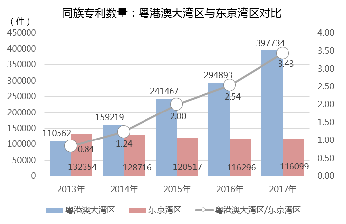 2013年—2017年粤港澳大湾区的同族专利总量除2013年外均高于东京湾区。在2013年粤港澳大湾区的同族专利总量为东京湾区的84%。2014年约为东京湾区的1.2倍,2015年为东京湾区的2倍。2016年、2017年差距进一步增大,2016年约为2.5倍,2017年约为3.4倍。