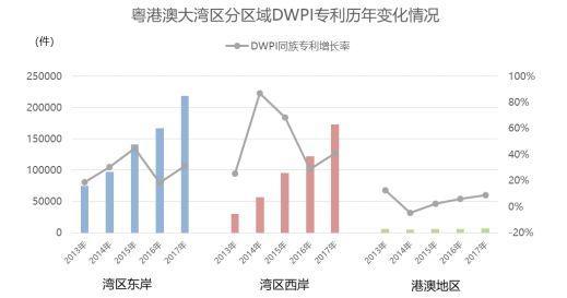 近五年数据显示,湾区东岸年均增长率为27.47%,湾区西岸为54.10%,港澳地区为7.33%。总量上,2017年湾区东岸的发明专利总量约为西岸1.5倍,湾区东岸总量达15万件以上,湾区西岸总量则接近10万件,港澳地区发明专利总量的增长量达到近五年的高峰。