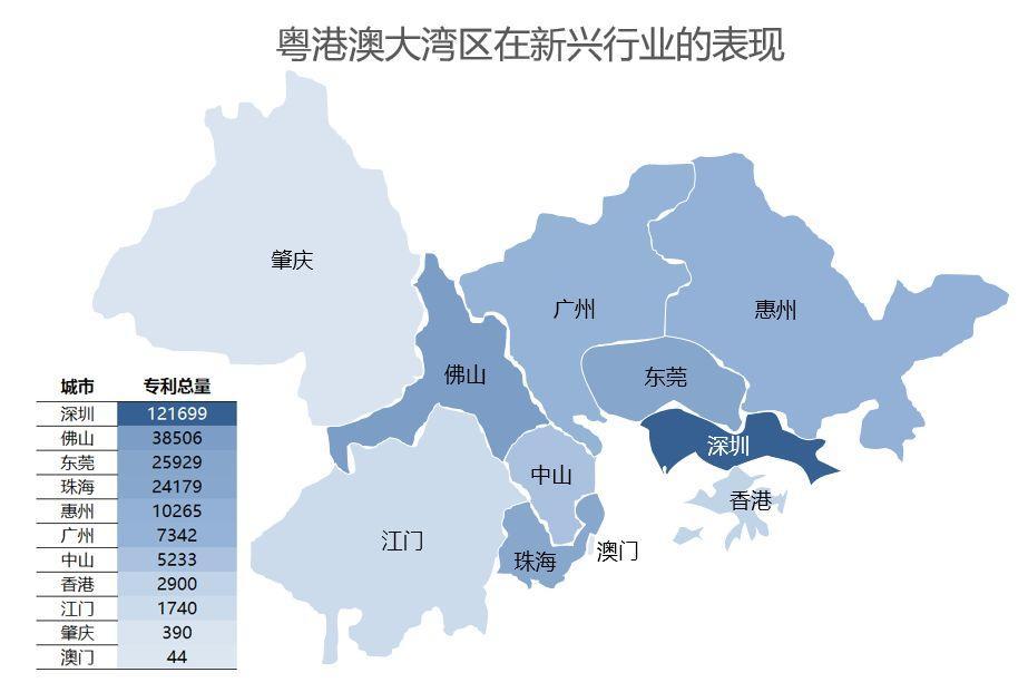 数据显示,近三年(2015—2017年)新兴行业专利总量共238227件。其中超五成的专利总量集中于深圳,共计121699件,其次为佛山,共38506件,占16.16%,紧接着为东莞(25929件)、珠海(24179件)和惠州(10265件)。近三年,湾区东岸共计专利15.79万件,深圳占77.08%,湾区西岸共7.74万件,佛山占比近五成,港澳地区共计2944件,其中98%集中于香港。