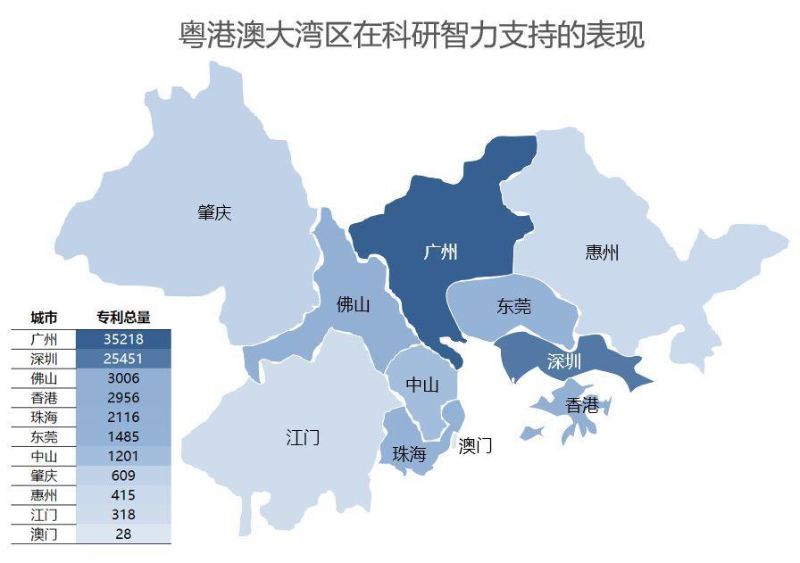 数据显示,近三年粤港澳大湾区在科研智力支持方面的专利总量共计72803件,广州和深圳在科研智力支持方面的专利占比超八成。其中广州最多,共35218件,占整个湾区的48.34%,其次为深圳(25451件),占比34.96%。近三年来,湾区东岸科研智力支持方面的专利共计2.74万件,深圳占了93%,湾区西岸共计4.25万件,广州占比82.93%,港澳地区共计2984件,其中99%集中于香港。
