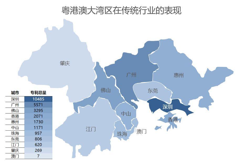 数据显示,近三年(2015—2017年)粤港澳大湾区专利总量共计26982件。其中最多的是深圳(10485件),其次为广州(5571件),排名第三的是佛山(3295件),香港(2071件)排位第四。近三年,湾区东岸传统行业专利总量共约1.30万件,主要集中于深圳(占湾区东岸80.52%)。湾区西岸共约1.19万件专利,主要集中于广州和佛山,分别占比46.88%和27.73%。港澳地区共有2078件,其中约99%的专利集中在香港。