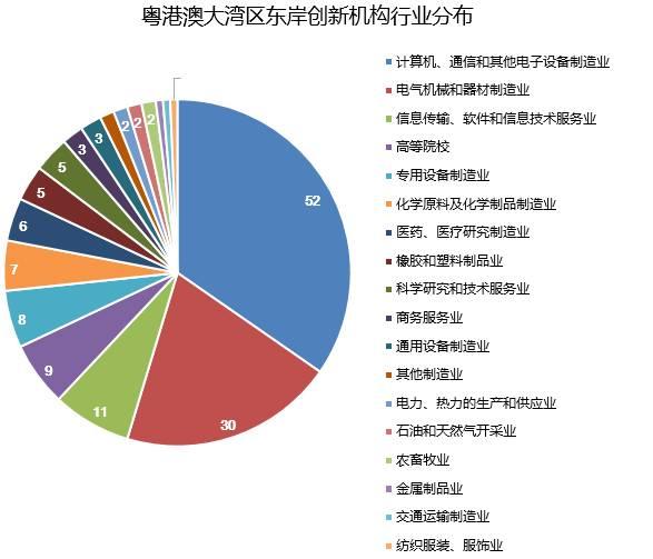 湾区东岸——共计150家创新机构入围,分布在18个行业,其中,计算机、通信和其他电子设备制造业(52家),电气机械和器材制造业(30家),信息传输、软件和信息技术服务业(11家)居前三。