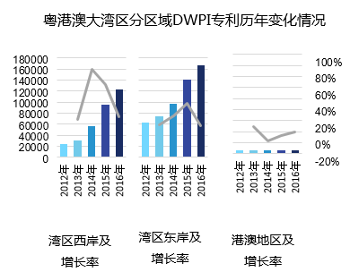 2012年—2016年,粤港澳大湾区东岸的DWPI专利数量多于湾区西岸和港澳地区,其中2016年东岸总量突破16万件,西岸突破12万件;在增长幅度上,湾区东岸和西岸都呈现逐年增长态势,但西岸增长率明显高于东岸,2014年增长率一度超过70%,而港澳地区的DWPI专利相对较少,每年均在2万件以内,2014年出现负增长。