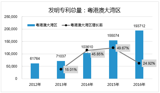 统计数据显示,2012年—2016年,粤港澳大湾区历年发明专利呈现逐年稳步递增趋势,其中2014年和2015年的增幅最大,接近50%。五年来粤港澳大湾区发明专利总量增幅达213.6%。