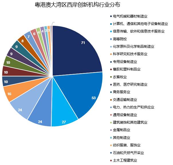 湾区西岸——报告中湾区西岸共计300家创新机构入围,分布在20个行业。其中,电气机械和器材制造业(71家),计算机、通信和其他电子设备制造业(53家),信息传输、软件和信息技术服务业(27家)居于前三位,高等院校和化学原料及化学制品制造业并列第四,科学研究和技术服务业位列第五。湾区西岸的广州高等院校表现强劲,在510个样本中有41所高校,其中广州占12所,且发明专利数在广州的创新机构中处于领先地位;湾区西岸制造业优势明显,有194家机构入围,占比64.67%;其中珠海和中山以电气机械和器材制造业、计算机、通信和其他电子设备制造业为龙头;佛山以电气机械和器材制造业为主,江门和肇庆以化学原料及化学制品制造业、电气机械和器材制造业为主。
