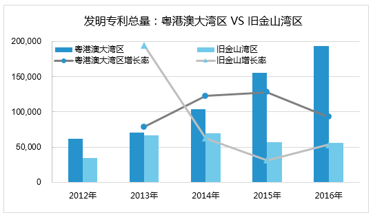 2012年粤港澳大湾区超过旧金山湾区2.76万件,到2016年比旧金山湾区多13.82万件,差距不断扩大。