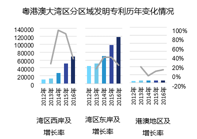 从总量分析,湾区东岸发明专利2016年突破10万件,湾区西岸则接近8万件,港澳地区一直在2万件以内。