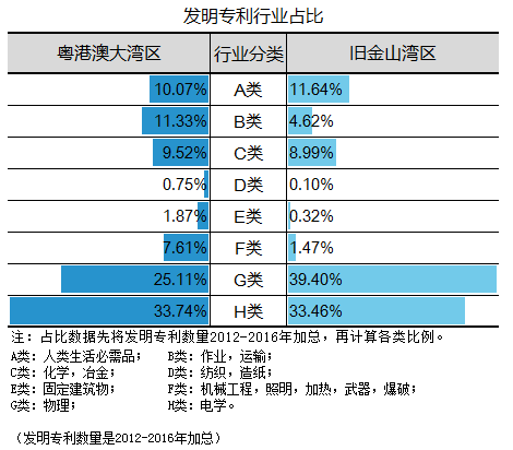 粤港澳大湾区发明专利主要以H类(电学)为主,占比最大为33.74%,其次是G类;“旧金山湾区”以G类(物理)为主,占比为39.40%,其次是H类。