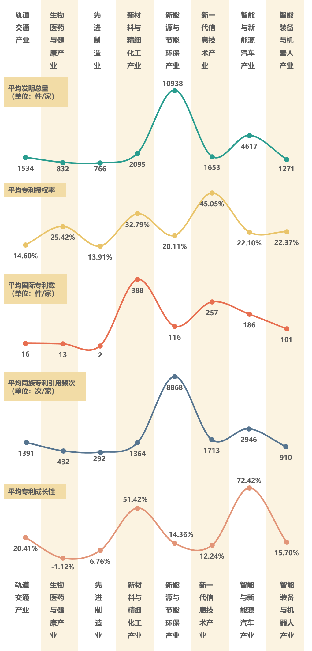 智能与新能源汽车产业企业呈现出高创新性、高成长性特征,专利复合增长率均值为72.42%,排名第一,较第二名高出21个百分点,在平均发明总量、平均同族专利引用频次两大维度排名第二,科研实力和创新影响力较强。