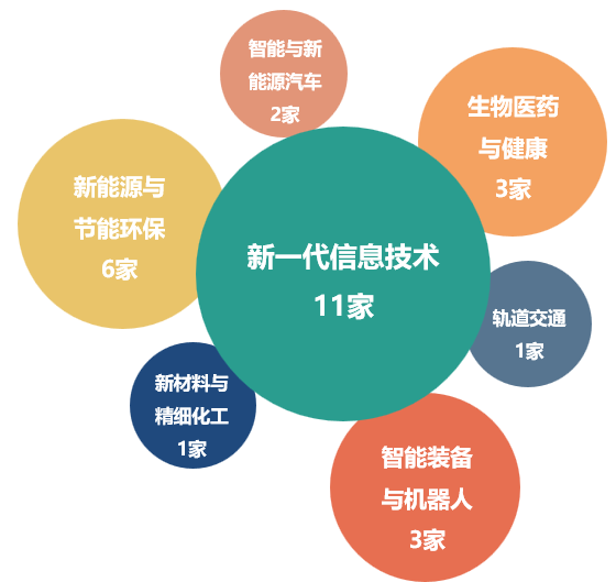 有27家企业属广州市“3+5”战略性新兴产业,占比90%,覆盖新一代信息技术产业(11家)、新能源与节能环保产业(6家)、生物医药与健康产业(3家)、智能装备与机器人(3家)等7大领域。