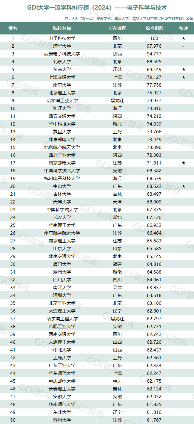我国高等教育正进入高质量发展新阶段,高校整体办学水平已位于世界前列。GDI大学一流学科排行榜(2024)研制团队认为,一所大学的某个学科排名进入全国前5,表明该大学这一学科的发展水平已跨入“世界一流学科”行列或接近“世界一流学科”水平;进入全国前25表明已进入“国内一流学科”行列;进入全国前50表明已进入“国内高水平学科”行列。