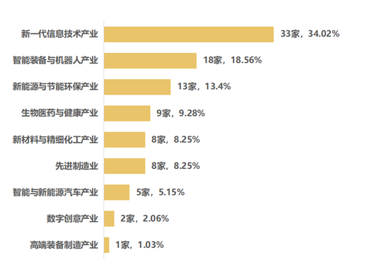 “国家级专精特新‘小巨人’企业(广州)创新TOP100榜(2024)”显示,超九成上榜企业属于新兴产业,共97家。根据《广州市战略性新兴产业发展“十四五”规划》“3+5+X”战略性新兴产业体系分类标准对上榜企业进行产业划分,其中属于新一代信息技术产业的数量最多,共33家,在97家上榜新兴产业企业中占比34.02%。其次是智能装备与机器人产业,有18家企业上榜,占比18.56%。属新能源与节能环保产业的13家,占比13.4%,位居第三。