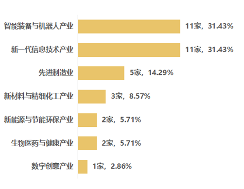 根据《广州市战略性新兴产业发展“十四五”规划》“3+5+X”战略性新兴产业体系分类标准对上榜企业进行产业划分。数据显示,上榜企业以新兴产业为主,共35家,占比达87.5%。属智能装备与机器人产业、新一代信息技术产业的最多,各有11家企业上榜,在上榜新兴产业企业中分别占比31.43%。其次是先进制造业(5家,占比13.89%)。其余新兴产业上榜企业分布在新材料与精细化工产业(3家)、新能源与节能环保产业(2家)、生物医药与健康产业(2家)、数字创意产业(1家)。