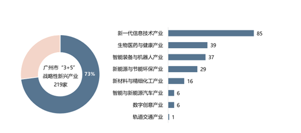 根据《广州市战略性新兴产业发展“十四五”规划》“3+5+X”战略性新兴产业体系分类标准对上榜企业进行产业划分。数据显示,300家企业中有219家属于广州市8大战略性新兴产业。上榜企业主要分布在新一代信息技术产业(85家)、生物医药与健康产业(39家)、智能装备与机器人产业(37家)等产业。