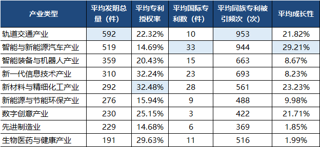 数据显示,轨道交通产业上榜企业创新能力及影响力较强,平均发明总量、同族专利被引频次分别为592件、953次,均位列第一;智能与新能源汽车产业平均国际专利数、成长性均位列第一,分别为33件、29.21%;新材料与精细化工产业平均专利授权率位列第一,为32.48%。