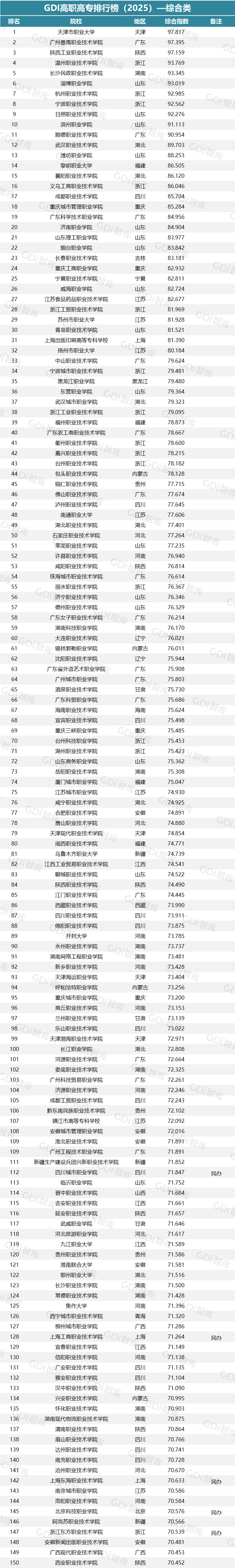 GDI高职高专排行榜(2025)—综合类榜单中,天津市职业大学、广州番禺职业技术学院、陕西工业职业技术学院位列前三,同时跻身总榜前十。