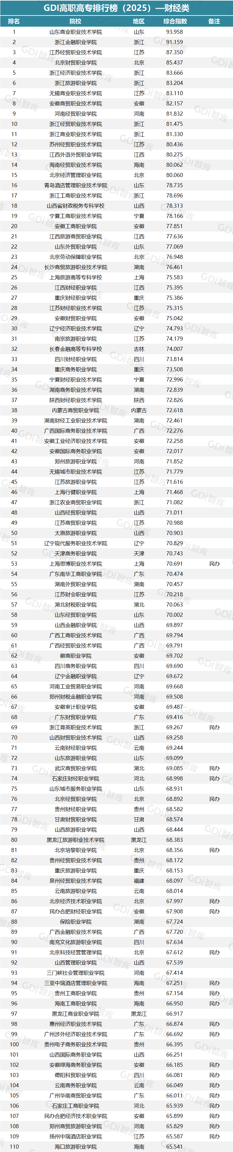GDI高职高专排行榜(2025)—财经类榜单中,山东商业职业技术学院、浙江金融职业学院、江苏经贸职业技术学院位列前三,其中山东商业职业技术学院位列总榜第十位。
