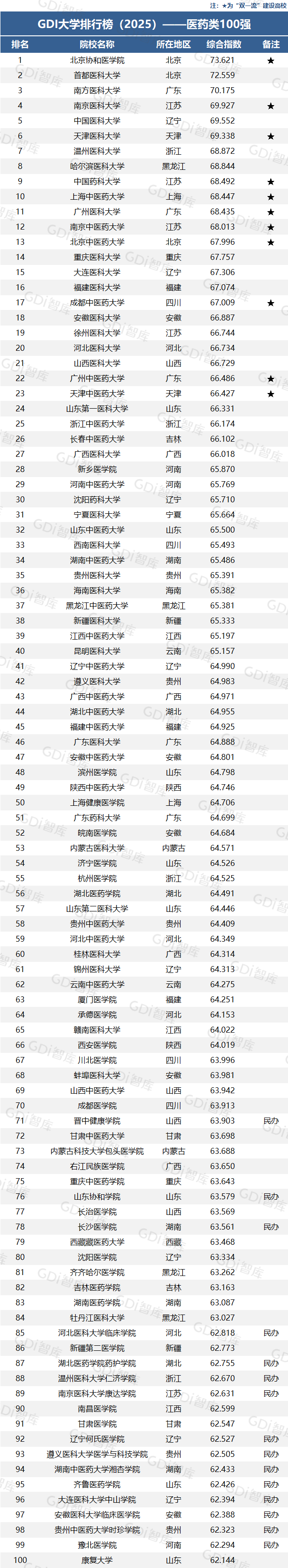 在“GDI大学排行榜(2025)——医药类100强”中,北京协和医学院、首都医科大学和南方医科大学位居前三,排名四至十位的分别是:南京医科大学、中国医科大学、天津医科大学、温州医科大学、哈尔滨医科大学、中国药科大学和上海中医药大学。