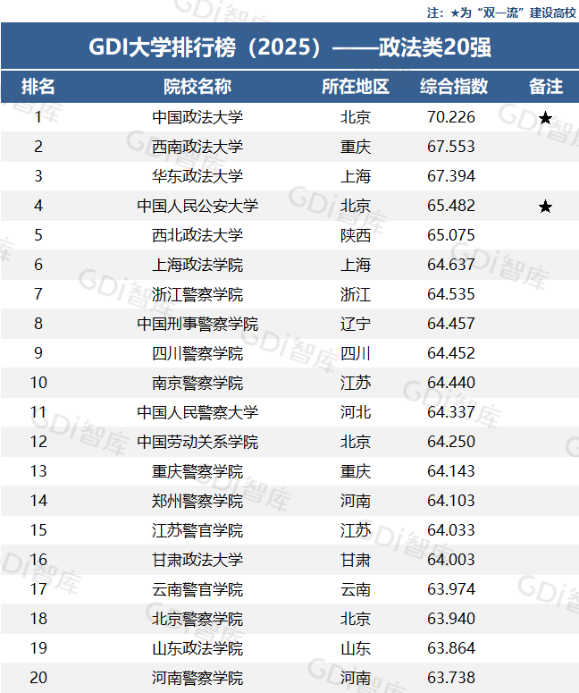 在“GDI大学排行榜(2025)——政法类20强”中,中国政法大学、西南政法大学和华东政法大学位居前三,中国人民公安大学、西北政法大学分列第四、第五位。