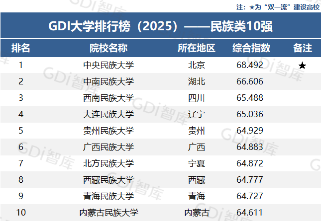 在“GDI大学排行榜(2025)——民族类10强”中,中央民族大学、中南民族大学和西南民族大学位居前三,大连民族大学、贵州民族大学分列第四、第五位。