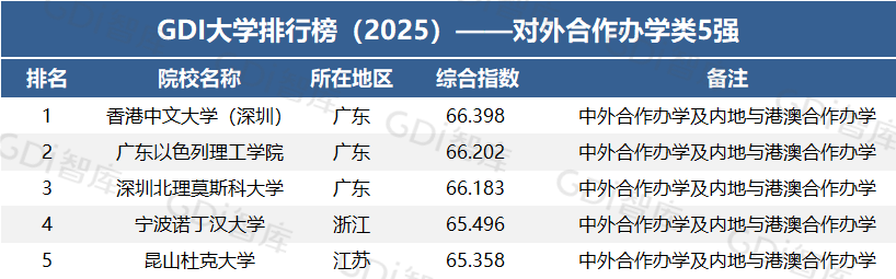 在“GDI大学排行榜(2025)——对外合作办学类5强”中,香港中文大学(深圳)、广东以色列理工学院和深圳北理莫斯科大学位居前三。