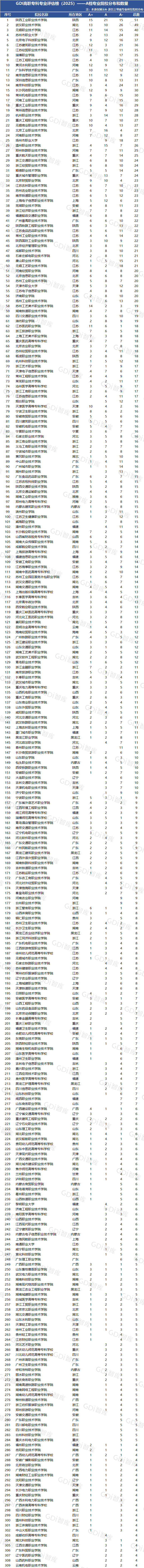 在GDI高职专科专业评估中,陕西工业职业技术学院有51个专业评估为A档(含A+、A、A-三个等级),其中A+专业15个,占比29.41%;武汉职业技术学院有49个专业获评A档,包含13个A+专业(占比26.53%);无锡职业技术学院40个A档专业中,A+专业11个(占比27.50%)。从区域分布看,江苏、浙江、山东、广东和湖南等省高职院校的A档专业数量位居前列。