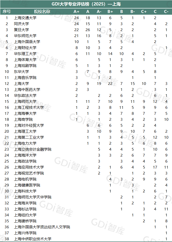 拥有A档(含A+、A、A-)专业数位列前三的院校中,复旦大学以60个居首;上海交通大学以55个位居第二;同济大学与华东师范大学并列第三,分别有50个。
