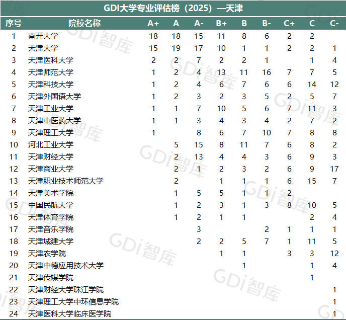 拥有A档(含A+、A、A-)专业数位列前三的院校中,南开大学与天津大学并列第一,分别有51个;河北工业大学以20个位居第二;天津财经大学以15个位居第三。