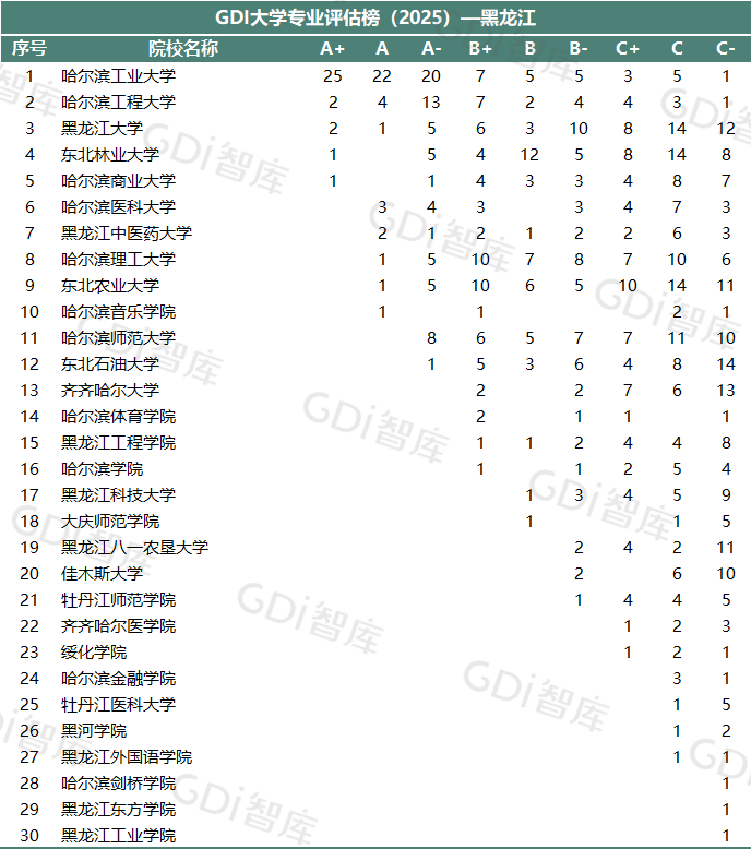 黑龙江有5所院校拥有A+专业,其中哈尔滨工业大学有A+专业25个,数量居黑龙江第一;哈尔滨工程大学和黑龙江大学各有A+专业2个,并列第二;东北林业大学、哈尔滨商业大学各有A+专业1个,并列第三。