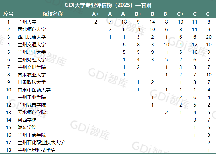 拥有A档(含A+、A、A-)专业数位列前三的院校分别为兰州大学(27)、西北师范大学(8)、兰州交通大学(6)。