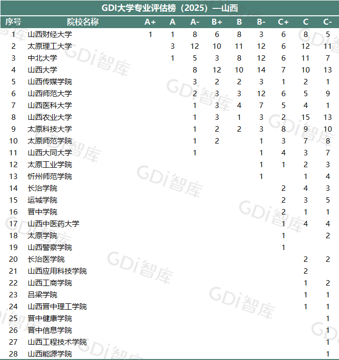 拥有A档(含A+、A、A-)专业数位列前三的院校分别为太原理工大学(15)、山西财经大学(10)、山西大学(8)。